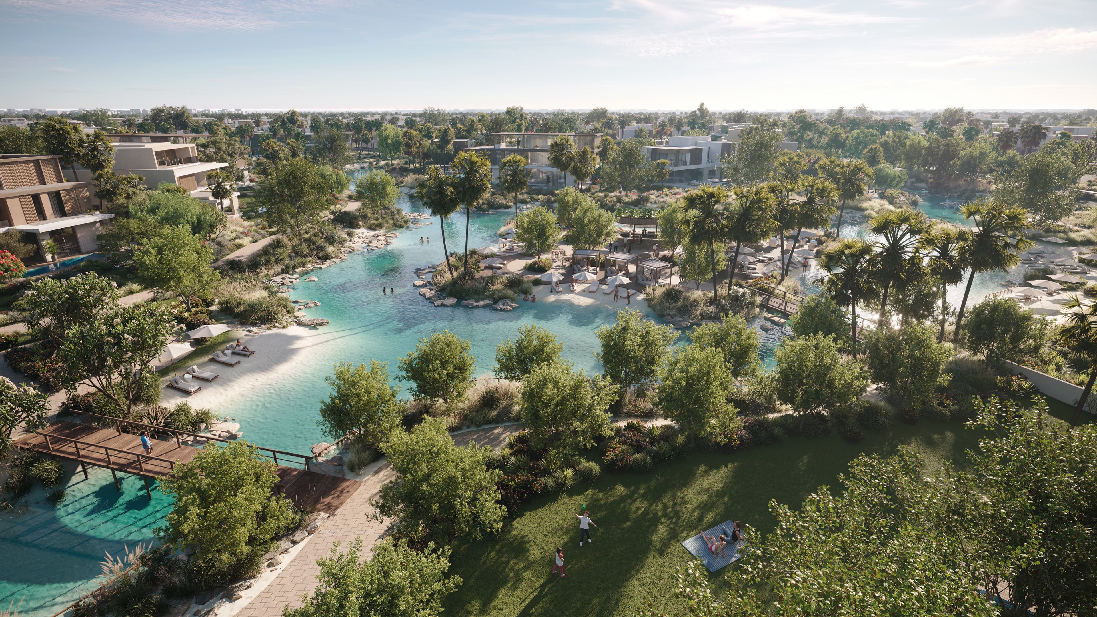 The units consist of three-, four- and five-bedroom villas, ranging from 3,048 sqft to 6,001 sqft, each with a private garden connected by landscaped pathways leading to the community’s central Halo Loop Park and a network of swimmable lagoons.